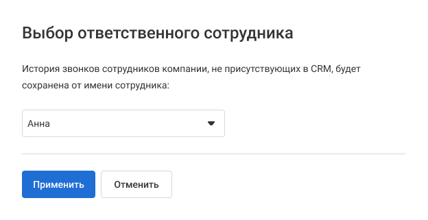 Включите настройку, выберите ответственного сотрудника из списка и нажмите «Применить».