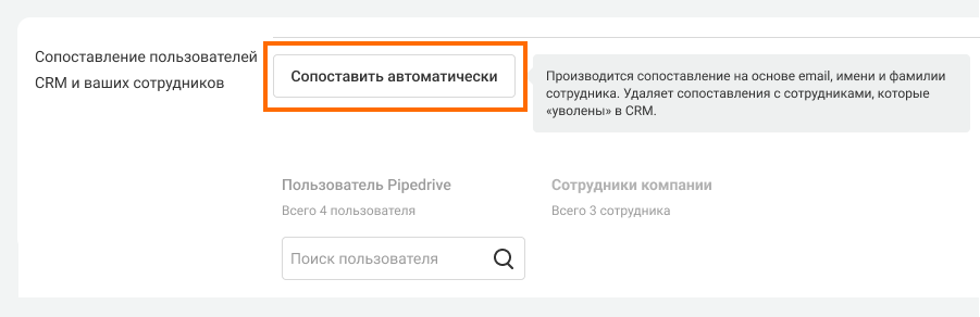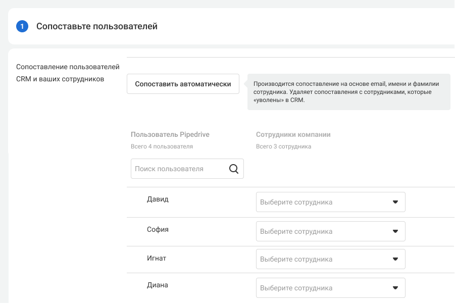В настройках интеграции с Pipedrive в АТС перейдите в блок «Сопоставьте пользователей».