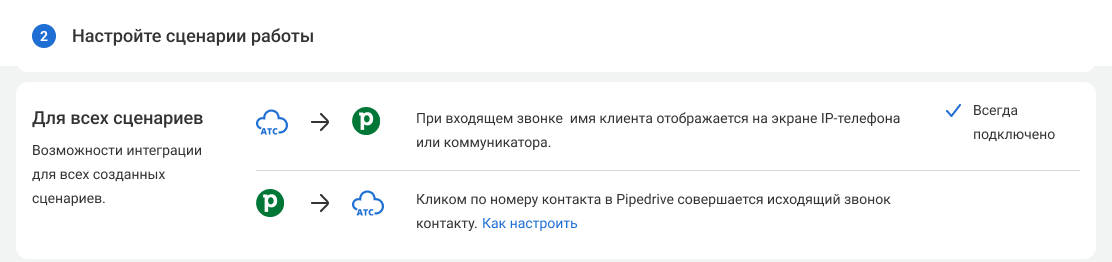 После того, как настроите все необходимые сценарии, начинайте пользоваться интеграцией Pipedrive с АТС.