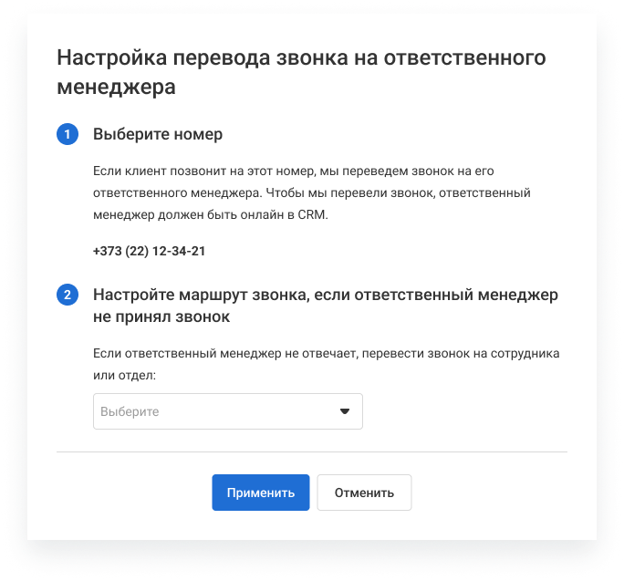 А затем данную опцию: выберите номер и настройте маршрут звонка, если ответственный менеджер не принял звонок. Можно перевести звонок на сотрудника или отдел.