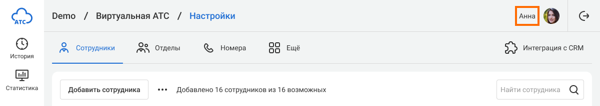 Возможности личного кабинета АТС не зависят от уровня доступа. Все, что описано ниже, настраивается одинаково у администраторов, пользователей и ограниченных пользователей.