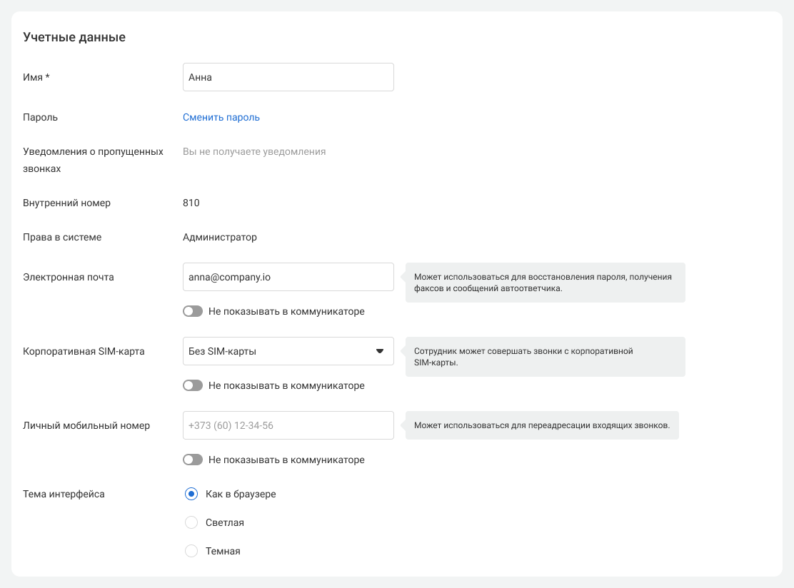 А также здесь указаны ваш внутренний номер, уровень прав в системе и то, как у вас настроены уведомления о пропущенных звонках.