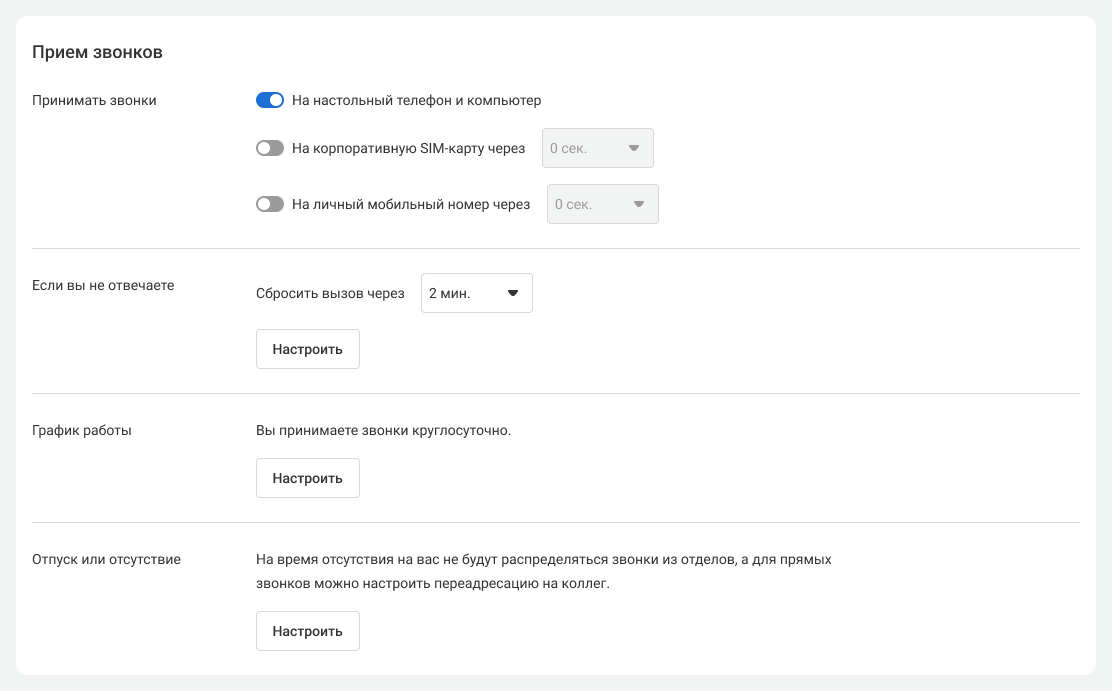 В блоке «Прием звонков» можно настроить важные критерии работы сотрудника, а именно: