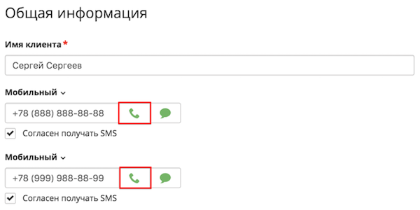 Совершать исходящие звонки можно из любого места, где есть номер телефона клиента: карточка заказа или клиента, общая страница «Заказы» или «Клиенты», отчет по звонкам. Просто кликните по номеру телефона и выберите, с какой трубки звонить.
