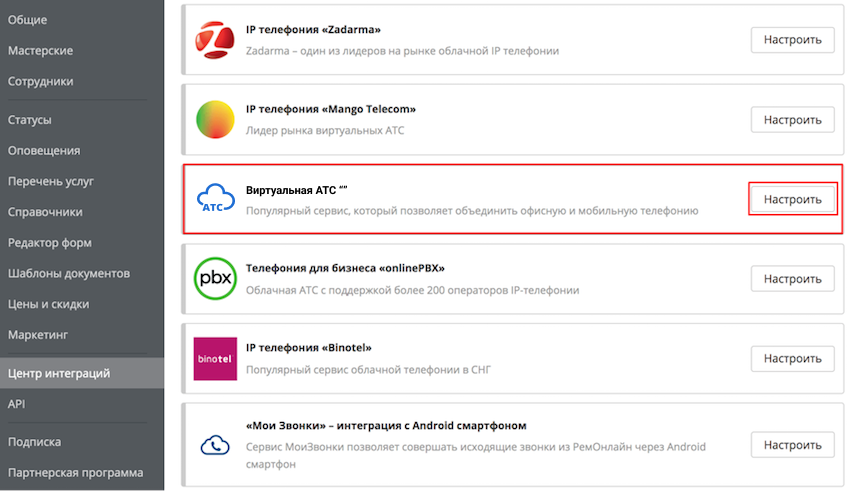 Войдите в свой аккаунт РемОнлайн и перейдите на страницу “Настройки > Центр интеграций”. Найдите там Виртуальную АТС и нажмите “Настроить”. Перед вами откроется окно настройки интеграции РемОнлайн с Виртуальной АТС.