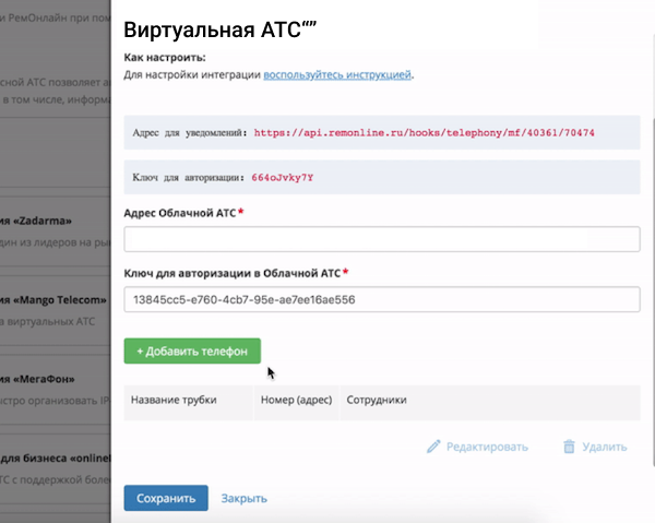 Из настроек интеграции РемОнлайн скопируйте параметры “Адрес для уведомлений” и “Ключ авторизации”, вставьте их в настройках интеграции в Виртуальной АТС. Сохраните настройки.