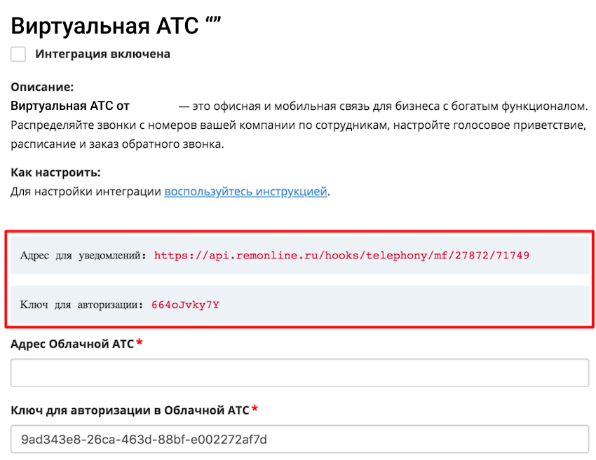 Cкопируйте из настроек ВАТС параметры “Адрес Виртуальной АТС” и “Ключ для авторизации в Виртуальной АТС”, вставьте их в соответствующие поля в настройках интеграции в РемОнлайн.