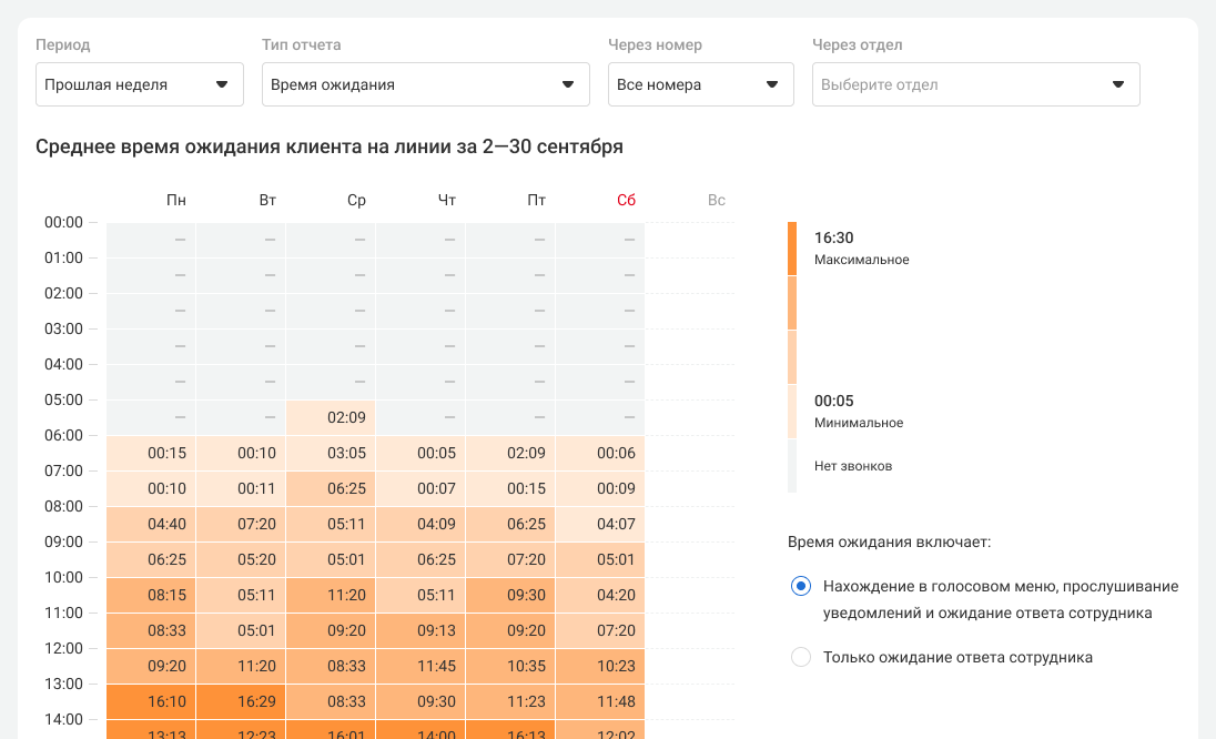 • только ожидание ответа сотрудника — то есть как долго клиенты слушали гудки.