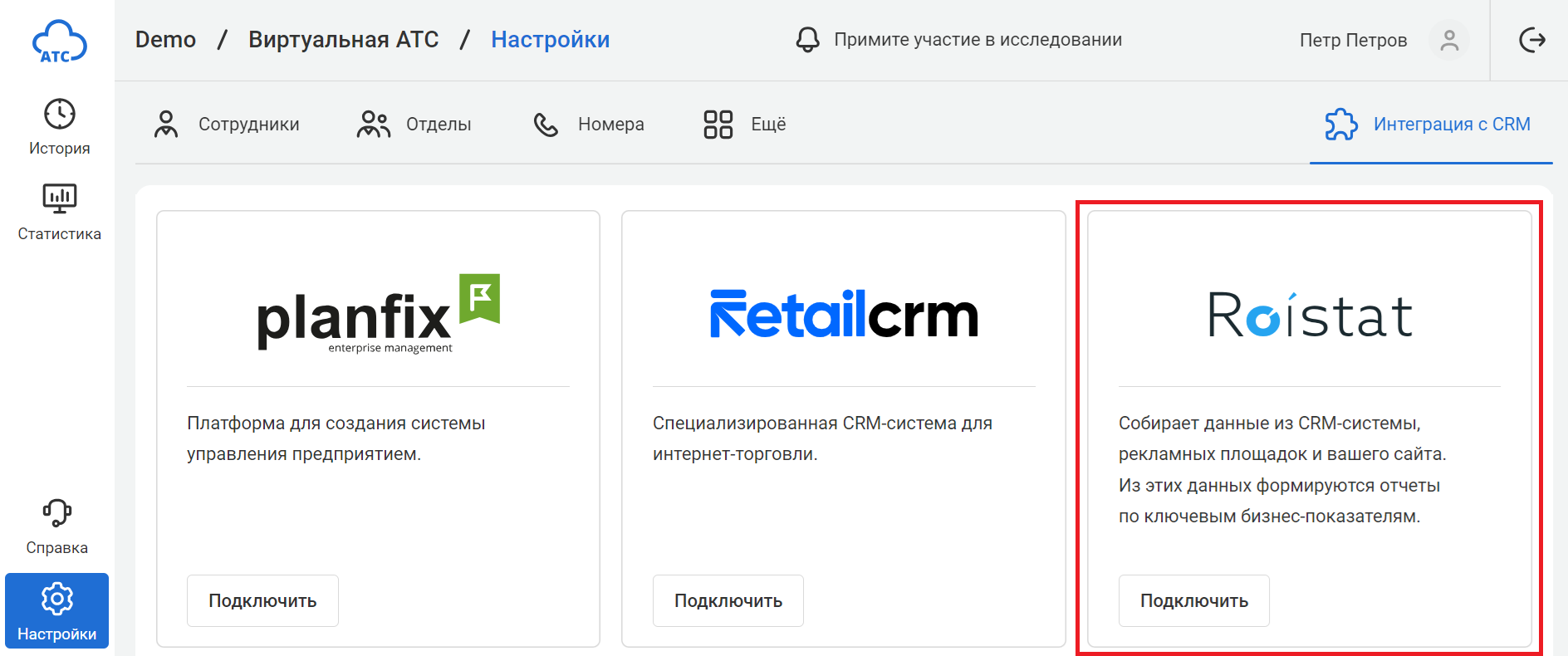 1. В настройках Виртуальной АТС перейдите в раздел «Интеграция с CRM». В списке интеграций найдите виджет Roistat, нажмите «Подключить».