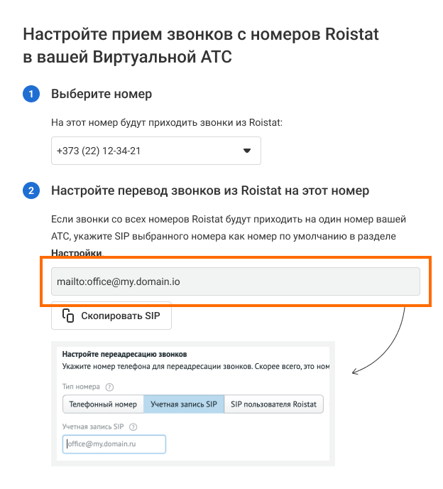 6. Выберите номер Виртуальной АТС, на который будут перенаправляться звонки с номеров Roistat. Скопируйте сгенерированный SIP-адрес. Нажмите кнопки «Применить» и «Сохранить».