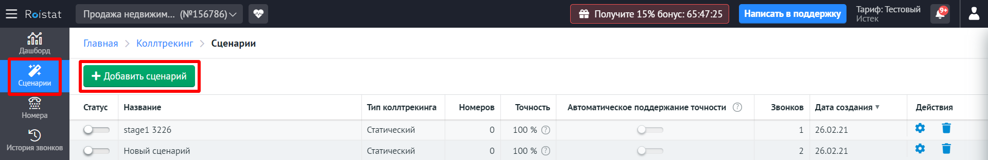 7. Настройте сценарии коллтрекинга для номеров Виртуальной АТС, которые будут принимать звонки с номеров Roistat. Для этого в интерфейсе Roistat зайдите в проект, откройте меню «Сценарии» и нажмите кнопку «Добавить сценарий».