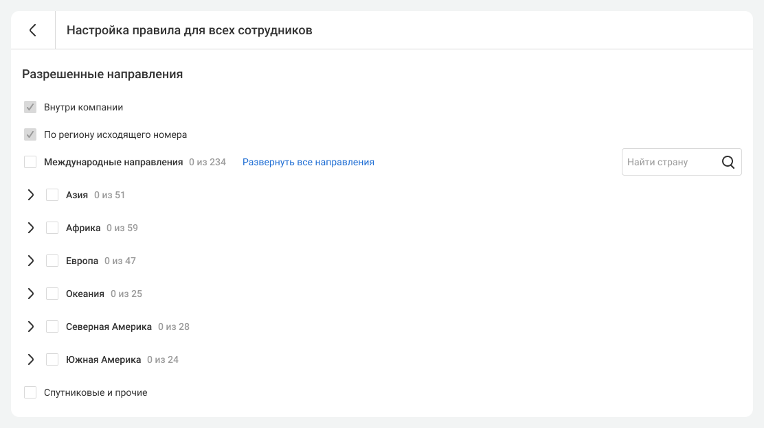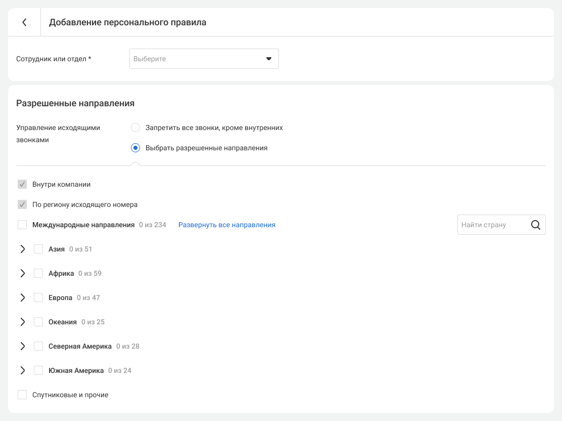 Выберите направления звонков, по которым сотрудники смогут совершать исходящие.