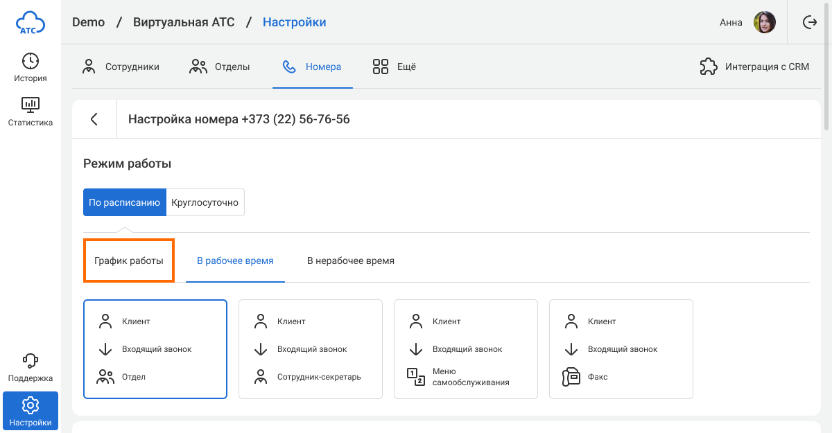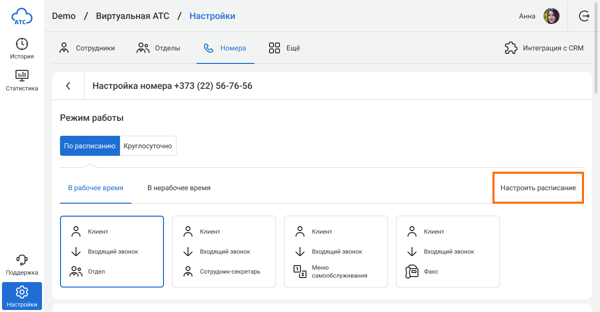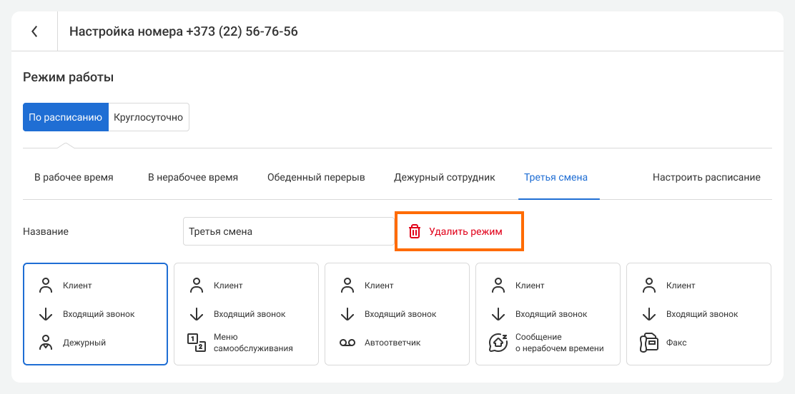 Выберите номер, для которого нужно установить расписание. В разделе «Режим работы» перейдите на вкладку «По расписанию» и нажмите «Настроить расписание».