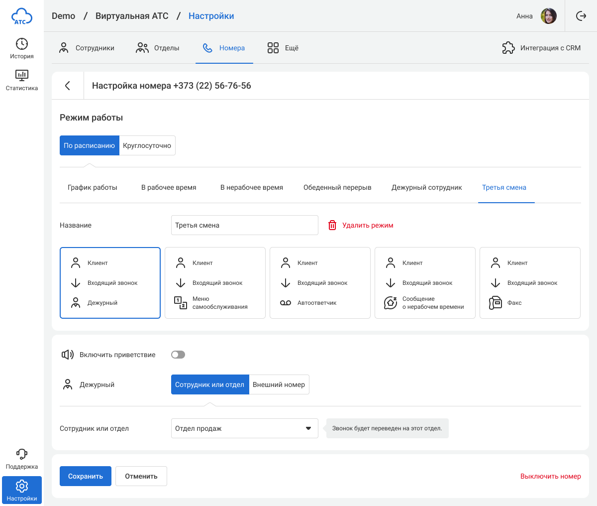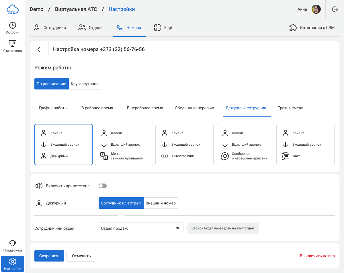 Персональный график работы менеджера устанавливается на вкладке «Сотрудники» в настройках его профиля. В нерабочее время АТС будет исключать сотрудника из очереди приема звонков в отделе и переводить все прямые вызовы, поступившие на его внутренний номер, на коллегу или в отдел. При этом клиенты услышат уведомление об отсутствии менеджера и будут готовы, что им ответит другой специалист.