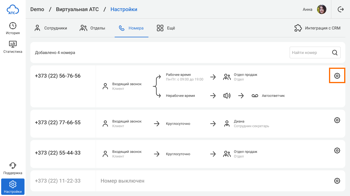 1. В разделе «Номера» – «Общие номера компании» выберите номер, один из режимов которого нужно удалить, и перейдите в его настройки.