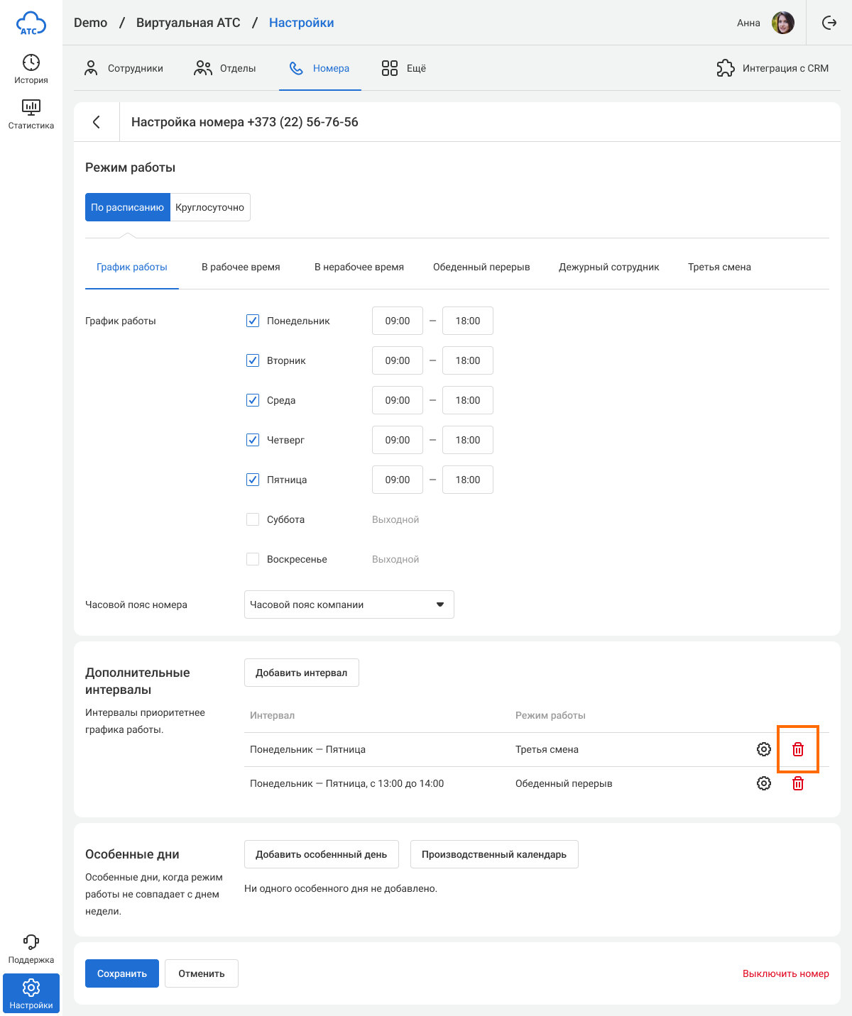 2. Нажмите «Настроить расписание». В блоке «Дополнительные интервалы» найдите режим, который хотите удалить (в нашем примере – «Третья смена»), и нажмите на «корзину» справа.