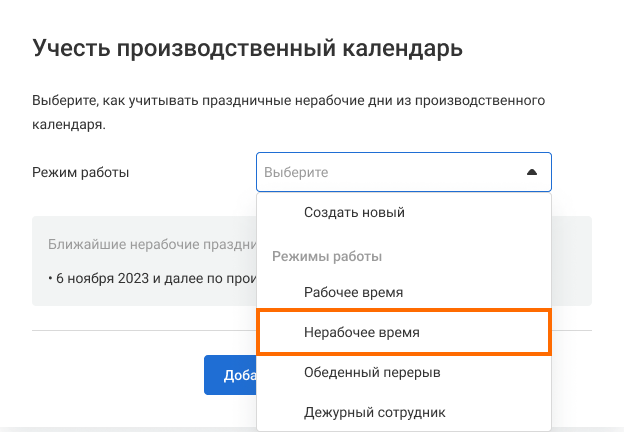 Обратите внимание: если в праздничные дни звонки на номер будет принимать дежурный сотрудник, при настройке производственного календаря в режиме работы выберите вариант «Дежурный сотрудник» и настройте прием звонков.
