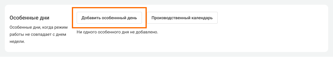 Например, вам нужно в сокращенный рабочий день уменьшить рабочие часы и в начале, и в конце дня. Создайте два особенных дня на одну дату. В первом укажете нерабочее время с утра, а во втором – нерабочее время вечером.