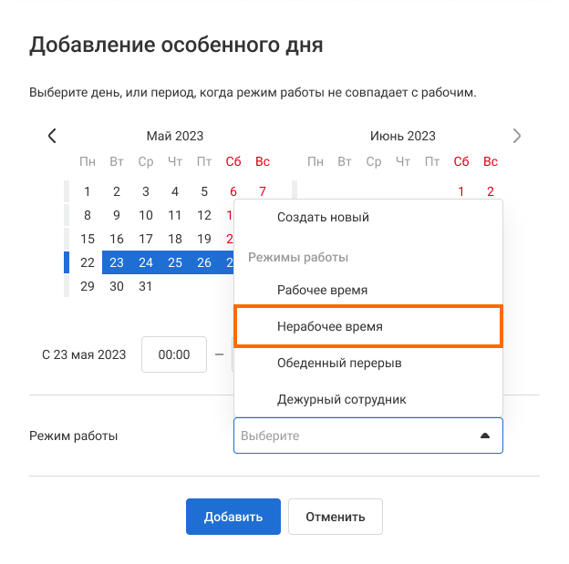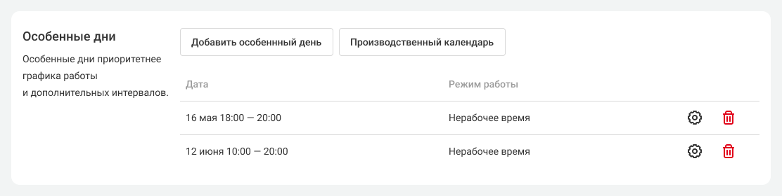 - особенный день – 16 мая с 8:00 до 9:00. И выберите режим работы для этого интервала – нерабочее время или дежурный сотрудник;
