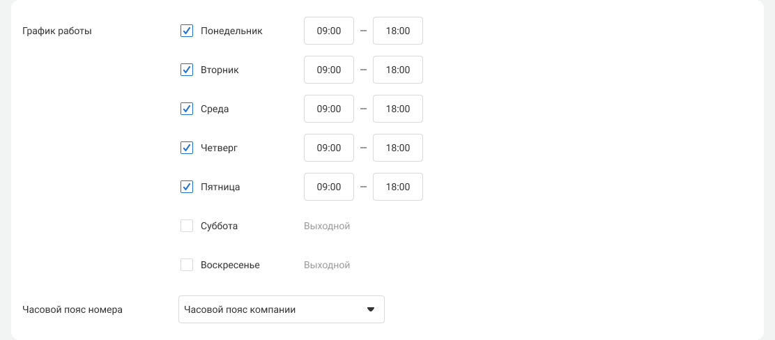 По умолчанию для каждого номера график работы устанавливается в часовом поясе компании. Но если настраиваемый номер должен принимать звонки в другом часовом поясе, отметьте это в расписании номера.