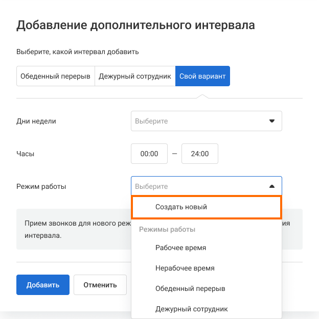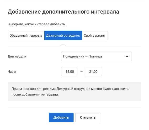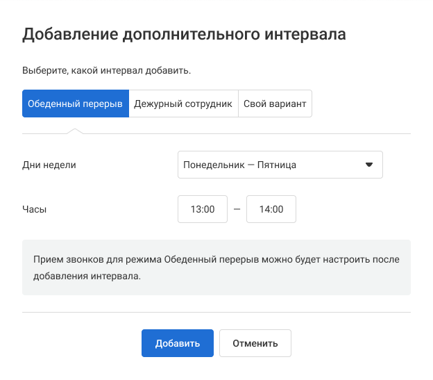Если работа в вашей компании организована сложнее и для создания корректного расписания вам недостаточно указать время обеденного перерыва и дежурства, вы можете создать собственный дополнительный интервал и настроить для него правила обработки входящих. Своих дополнительных интервалов может быть сколько угодно.