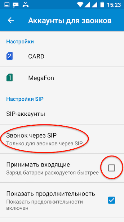 4. Если вы хотите принимать входящие звонки через SIP и/или совершать все исходящие через SIP — сделайте соответствующие настройки.