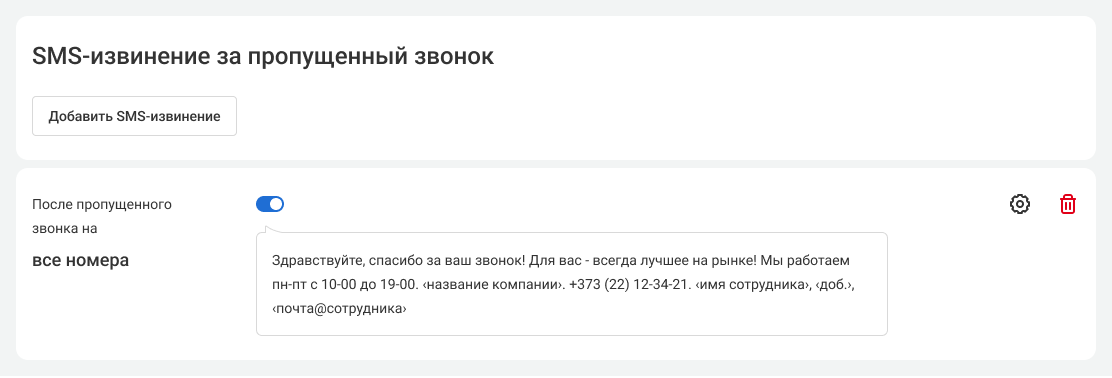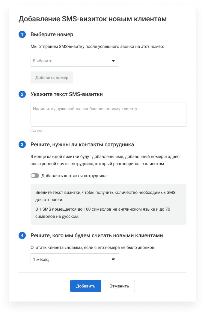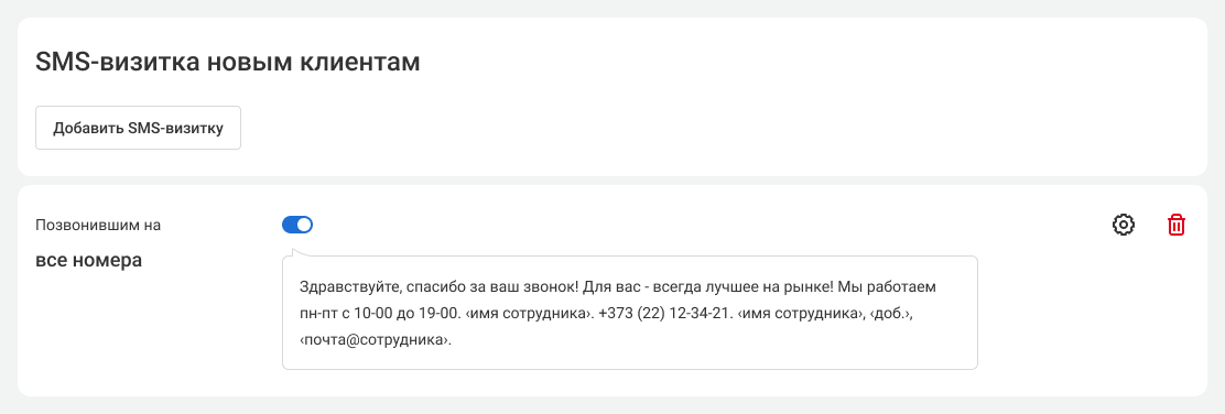 Настройте текст приветственной SMS. Также вы можете настроить, чтобы в SMS автоматически вставлялись контакты сотрудника, с которым говорил клиент (контакты берутся из данных о сотрудниках), настроить время, когда клиент считается новым, а также включить разные SMS-визитки для ваших номеров.