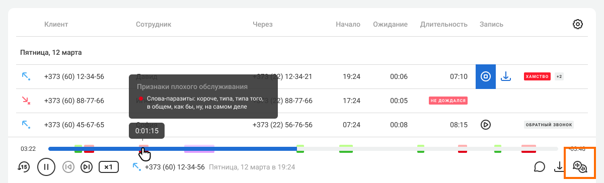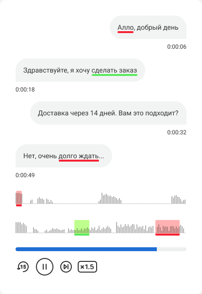 В плеере при прослушивании записи разговора все моменты с признаками продаж и плохого обслуживания будут выделены соответствующим цветом. Вы быстро найдете нужное место в разговоре.