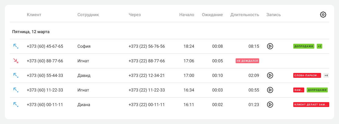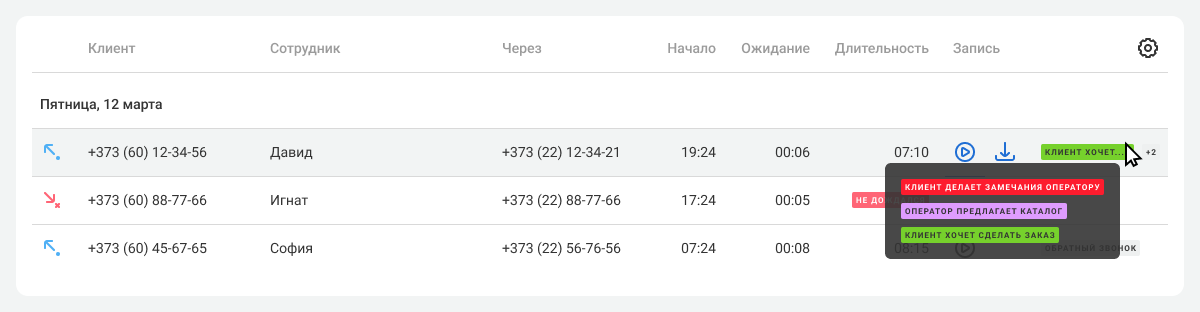 Звонки, в которых Речевая аналитика нашла признаки продаж или плохого обслуживания, в Истории сопровождаются цветными метками. Они содержат название признака и для наглядности выделяются цветами: зеленый – признаки продаж, а красный – признаки плохого обслуживания.