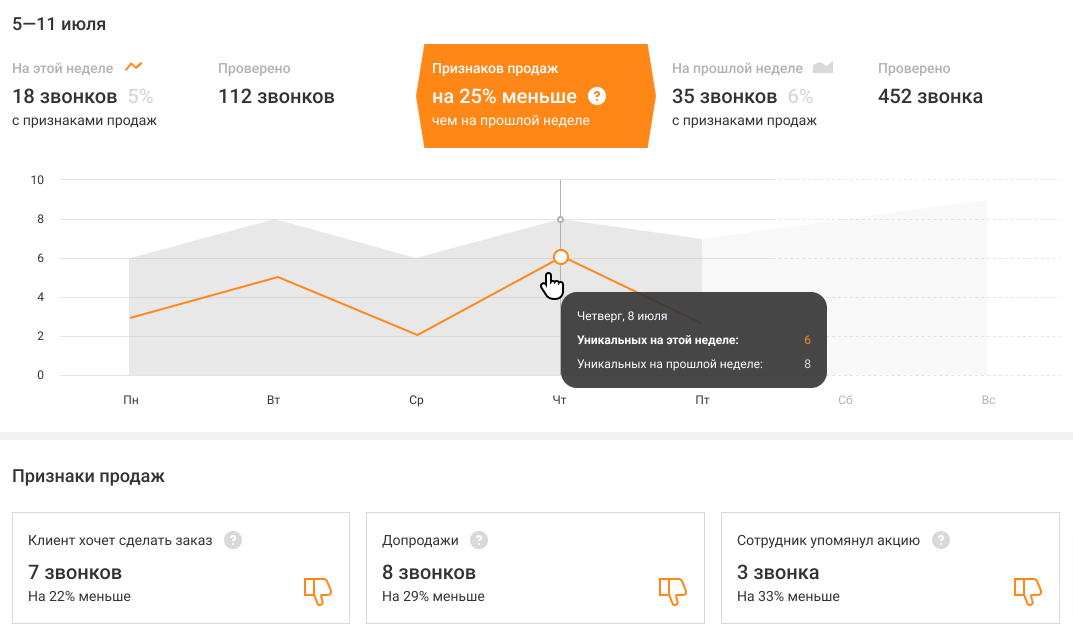 На основе собранных данных Речевая аналитика не только строит понятные отчеты и сравнивает выбранные периоды, но и рассказывает, лучше или хуже стали показатели обслуживания и продаж.