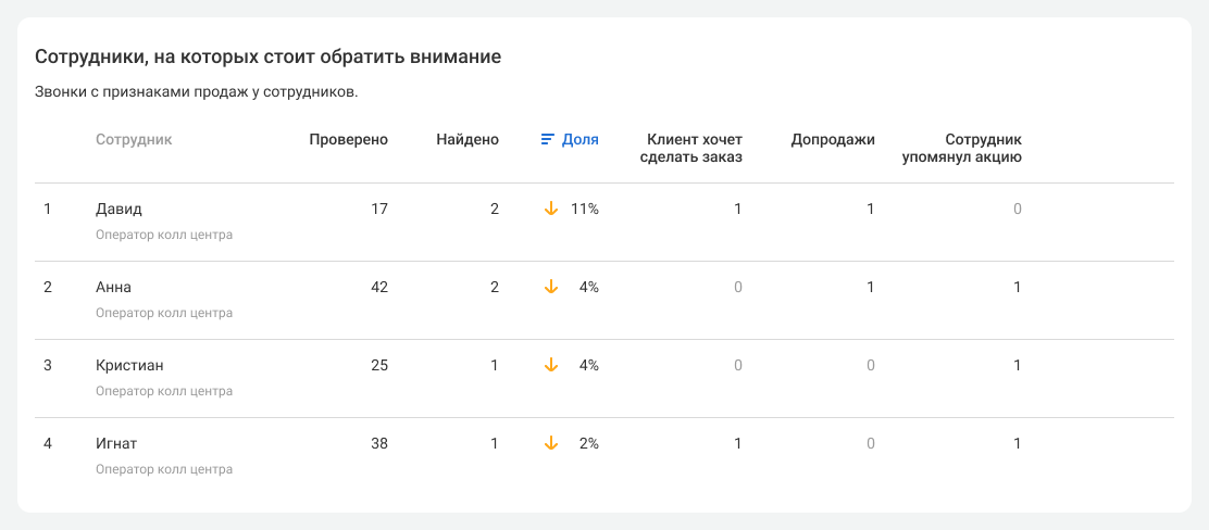 По количеству найденных признаков продаж и плохого обслуживания вы легко сравните результаты работы менеджеров и быстро поймете, почему одни справляются с обслуживанием клиентов менее успешно, чем другие.