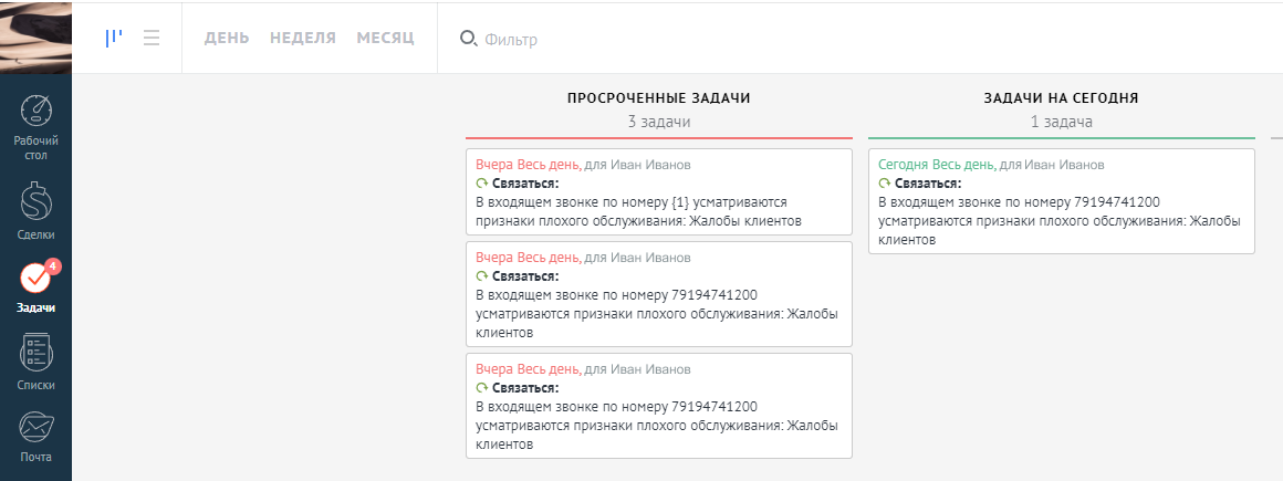 - В amoCRM: как только АТС найдет признаки плохого обслуживания клиентов, в CRM сразу появится задача по отработке негатива. При этом вам будет доступна вся история сделок и договоренностей с этим покупателем.