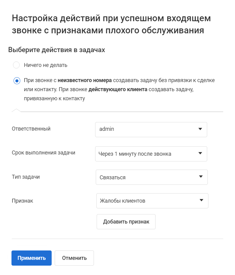 3. В окне с дополнительными настройками выберите ответственного за эту задачу. Им может быть как руководитель, так и старший менеджер или любой другой сотрудник, чей аккаунт в ОАТС связан с аккаунтом в amoCRM. Далее выберите срок выполнения и тип задачи. Укажите один или несколько признаков плохого обслуживания, которые хотите отслеживать в amoCRM.