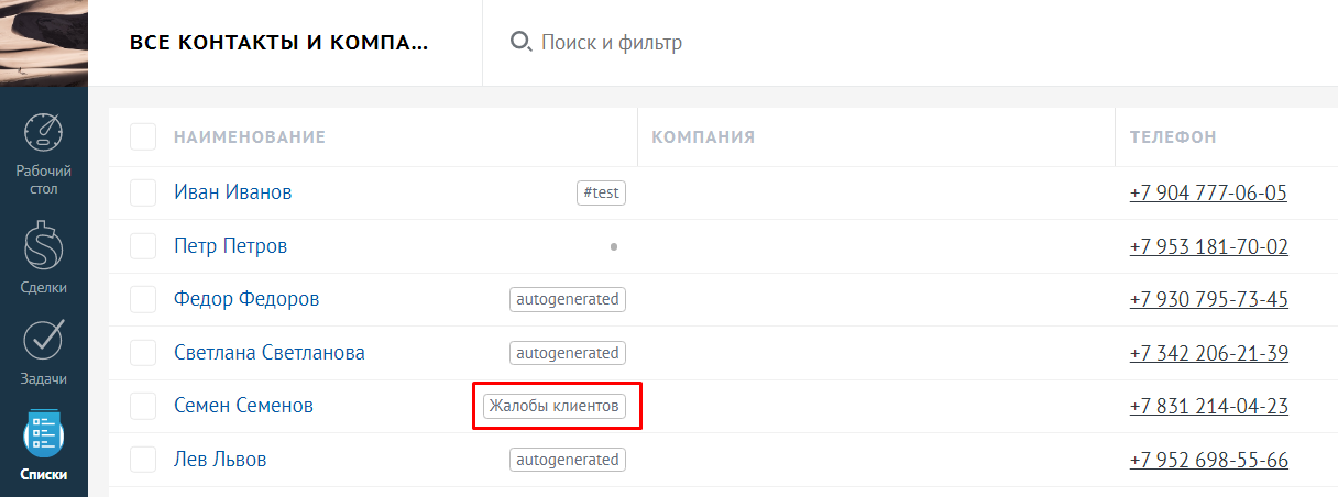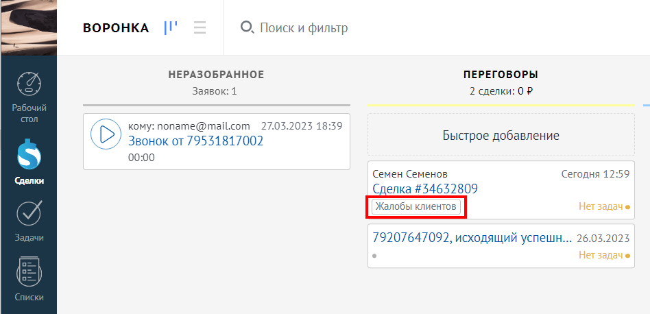 При звонках с признаками продаж и плохого обслуживания amoCRM автоматически добавит соответствующие теги к двум карточкам: