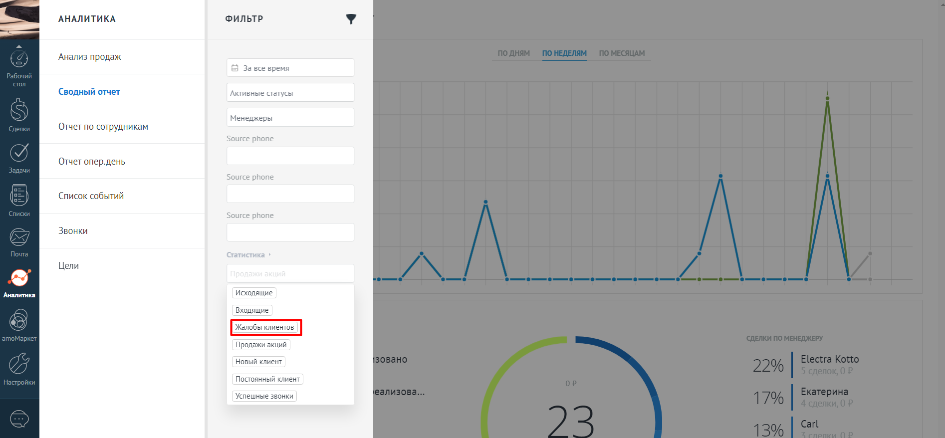 Впоследствии по этим тегам можно смотреть статистику звонков прямо в amoCRM и соотнести ее со статистикой продаж. Так вы узнаете, сколько раз менеджеры предлагали дополнительные услуги или товары по акции и какая доля таких активностей привела к продажам.