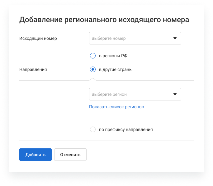 1. В блоке «Региональные исходящие номера» нажмите на кнопку «Добавить номер». 2. Во всплывающем окне выберите номер телефона. 3. выберите направление «в другие страны». В раскрывающемся списке выберите регион, при звонках в который будет подставляться указанный выше номер. Либо кликните «Показать список регионов», чтобы увидеть все доступные страны, сгруппированные по регионам и выберите направление там.