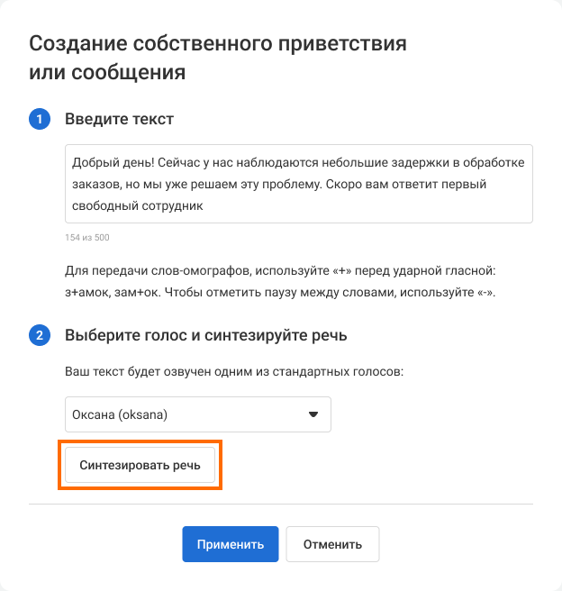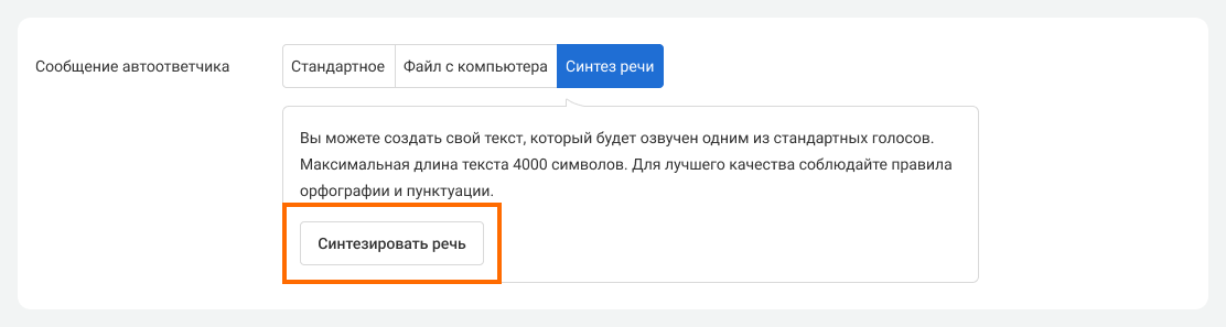 2. Введите текст приветствия, выберите голос, который озвучит ваш текст, и нажмите кнопку «Синтезировать речь».