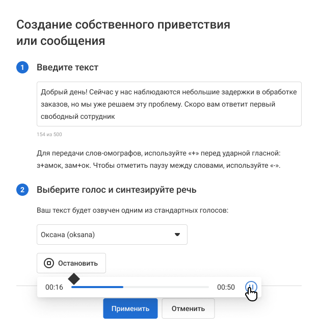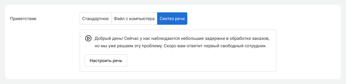 Вы можете заменить приветствие в любой момент, отредактировав текст сообщения на вкладке «Синтез речи». Также вам всегда доступно стандартное приветствие и возможность загрузить до 40 собственных файлов приветствий.