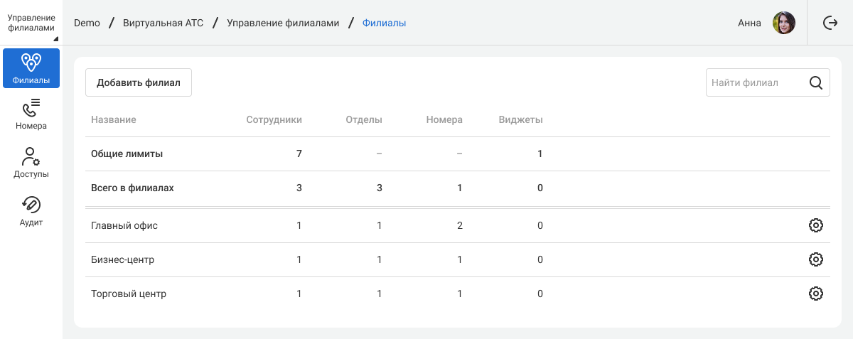 В кабинете управления филиалами можно редактировать настройки сразу по всем филиалам. Также здесь можно создавать новые филиалы, распределять номера между филиалами, выдавать доступы к их администрированию или просмотру и отслеживать историю действий сразу по всем доменам компании.