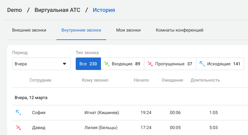 Все, теперь вы можете совершать и переводить звонки по коротким (внутренним) номерам между Виртуальными АТС. Такие вызовы будут отображаться в Истории на вкладке Внутренние вызовы, и их можно будет прослушать. В колонке «Кому звонил» в скобках будет указано название филиала, к которому относится менеджер.