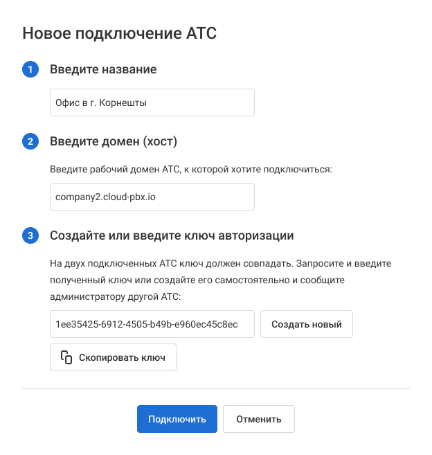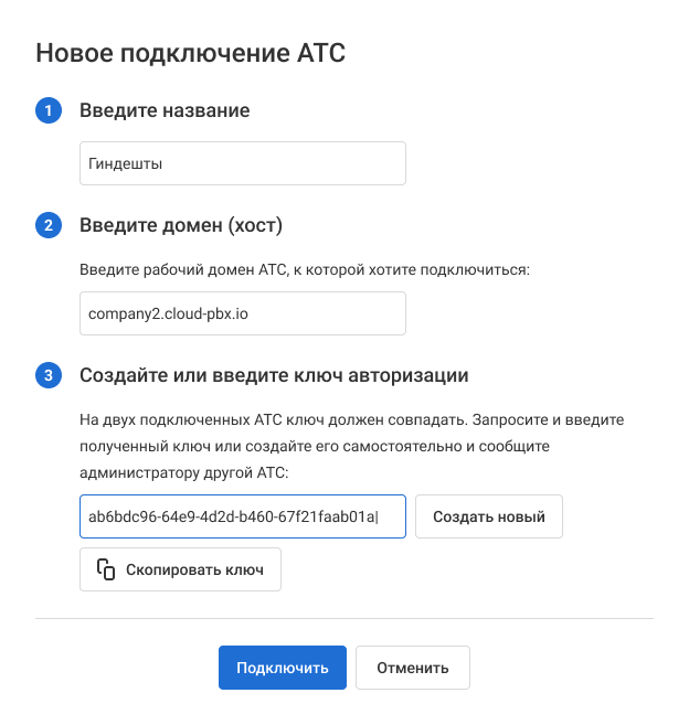4. Теперь перейдем в ту Виртуальную АТС, которую мы хотим добавить. Таким же образом добавим данные нашей первой Виртуальной АТС. Только в поле «Ключ авторизации» введем тот ключ, который мы создали в первой Виртуальной АТС.