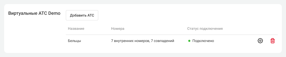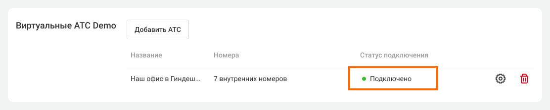 5. Если вы все сделали правильно, ваши АТС обменяются списками сотрудников и отделов вместе с их короткими номерами. В интерфейсе обеих Виртуальных АТС статус сменится на «Подключено». Нажмите «Сохранить».