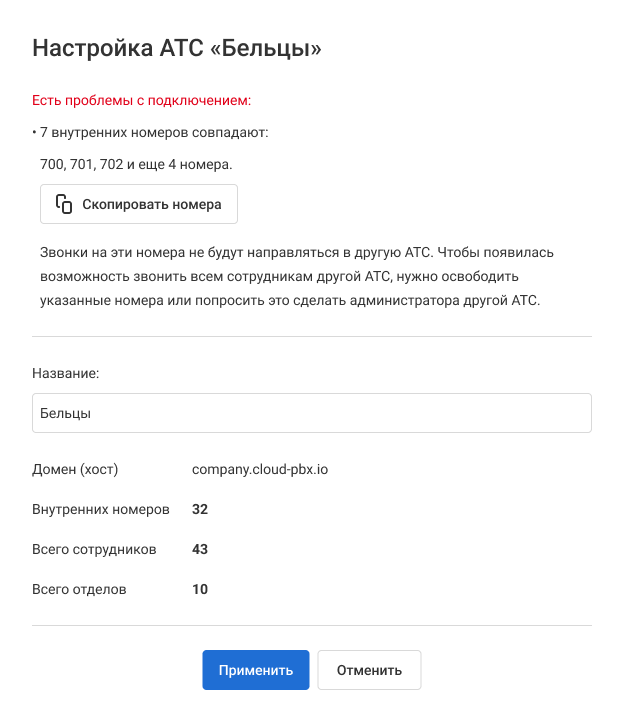Это не будет препятствовать подключению одной АТС к другой, однако сотрудникам, которые имеют пересекающиеся номера, нельзя будет позвонить из другой АТС. При подключении появится сообщение с предупреждением: