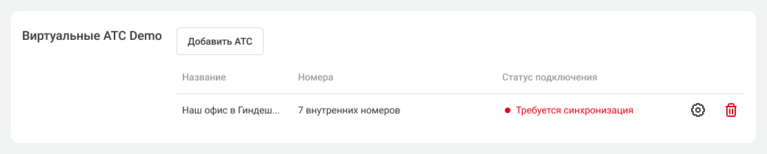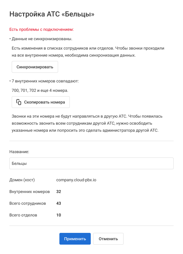 Если автосинхронизация не произошла, в настройках подключения к другой АТС появится кнопка «Синхронизировать». Нажмите ее, чтобы выполнить синхронизацию вручную.