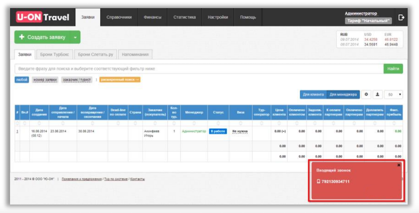 Работа U-ON.Travel в интеграции с Виртуальной АТС