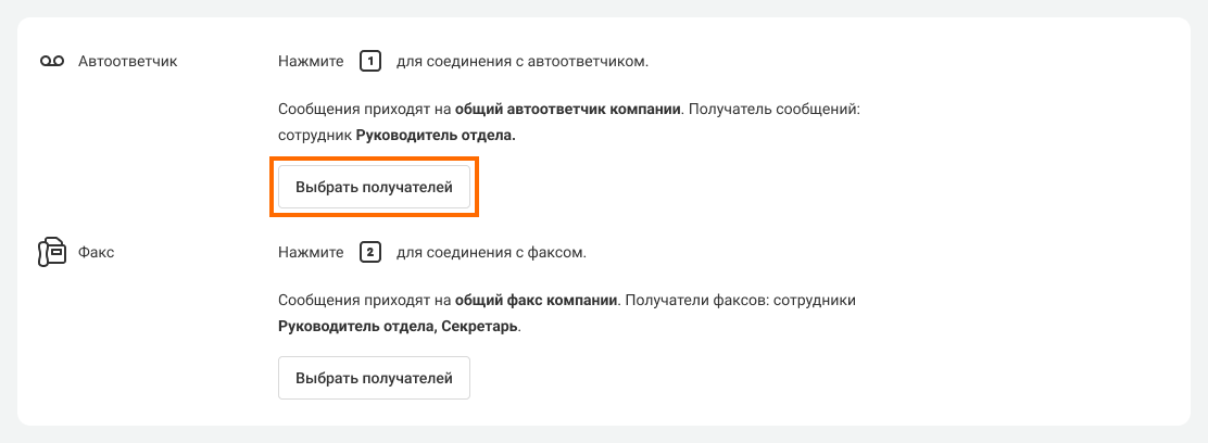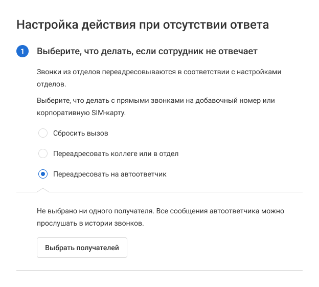 4. По умолчанию при нажатии на кнопку «1» звонок будет направляться на общий автоответчик компании. Чтобы изменить настройки автоответчика, нажмите «Выбрать получателей».