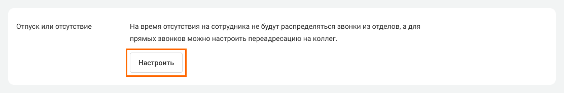 1. В блоке «Прием звонков» у подзаголовка «Отпуск или отсутствие» кликните на кнопку «Настроить».