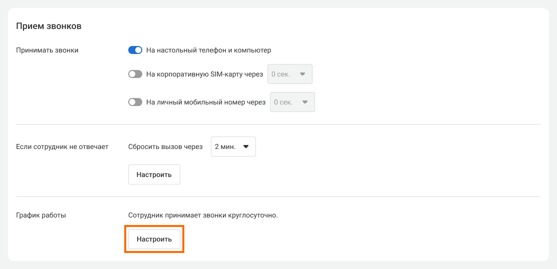 1. В блоке «Прием звонков» у подзаголовка «График работы» кликните на кнопку «Настроить».