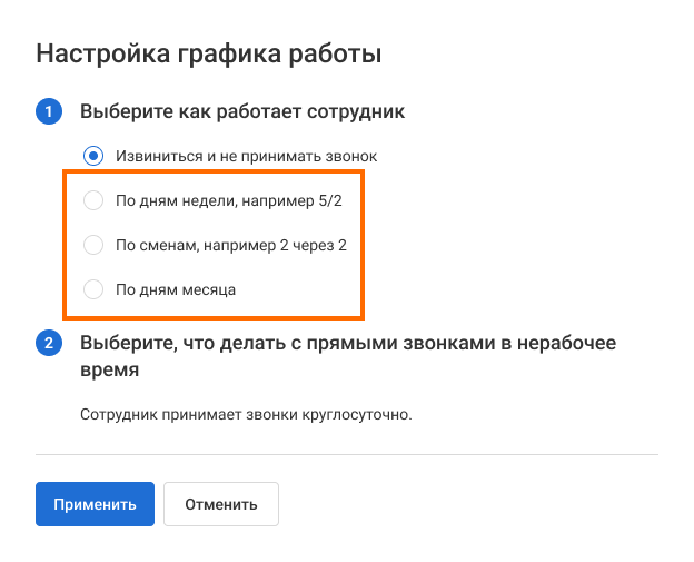 2. Выберите, как работает сотрудник. Переадресация прямых звонков на автоответчик доступна для всех графиков работы, кроме круглосуточного.