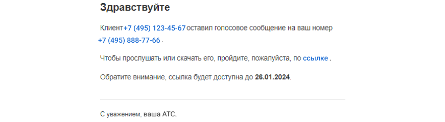 Если вы указаны в качестве получателя сообщений автоответчика, то после того, как клиент или сотрудник оставит голосовое сообщение, вы получите письмо со ссылкой для прослушивания. Ссылка на голосовое сообщение будет доступна в течение 7 дней с момента получения электронного письма.